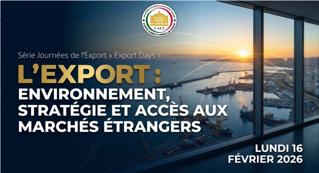 الجــزائــر : تنظم الغرفة الجزائرية للتجارة والصناعة يومًا تكوينيًا حول التصدير ,”يوم التصدير التصدير: البيئة، الاستراتيجية والولوج إلى الأسواق الخارجية” , الموجهً للمتعاملين الاقتصاديين الراغبين في هيكلة مقاربتهم للتصدير والتموقع المستدام…