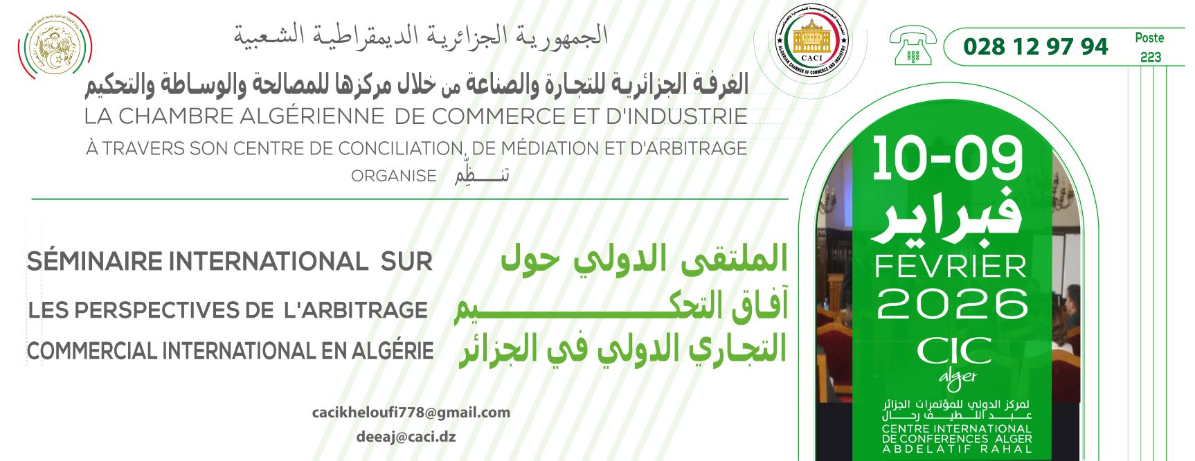 الجــزائــر : تُعلم الغرفة الجزائرية للتجارة والصناعة كافة المتعاملين الاقتصاديين والمهتمين بأنها ستنظم، عبر مركز المصالحة والوساطة والتحكيم، ملتقى دوليًا حول « آفاق التحكيم الدولي في الجزائر: الإصلاحات، الاستقطاب والتكامل الدولي »، وذلك يومي 09 و10 فيفري 2026 بالمركز الدولي للمؤتمرات عبد اللطيف رحال – الجزائر، ابتداءً من الساعة 08:30.